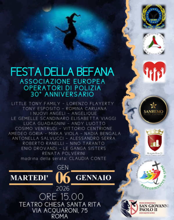 Festa della Befana delle Polizia al Teatro Chiesa Santa Rita per festeggiare il 30° anniversario degli operatori di Polizia.
